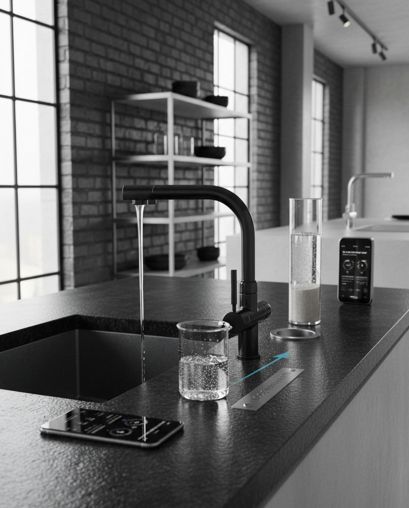 Grâce à sa configuration intelligente à circuits séparés, ce robinet centralise l'eau chaude, l'eau froide et l'eau filtrée en un seul point de distribution. L'eau purifiée circule dans un conduit interne totalement indépendant, garantissant qu'elle ne soit jamais en contact avec l'eau non traitée. Son fini mat n'est pas seulement esthétique : il est également conçu pour être résistant et limiter l'apparition de traces, offrant ainsi un look impeccable durablement.