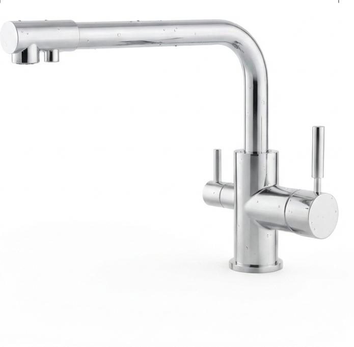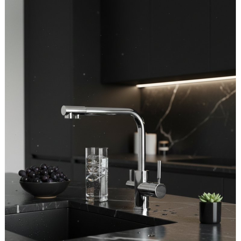 Conçu pour intégrer parfaitement votre système de traitement de l'eau, il distribue l'eau chaude, l'eau froide et l'eau filtrée via un seul corps de robinet. Sa technologie à doubles conduits séparés garantit que l'eau purifiée (issue d'un osmoseur ou d'un filtre) reste totalement isolée de l'eau du réseau domestique. Son design bas et robuste offre une esthétique sobre et une prise en main ergonomique pour un usage quotidien intensif.