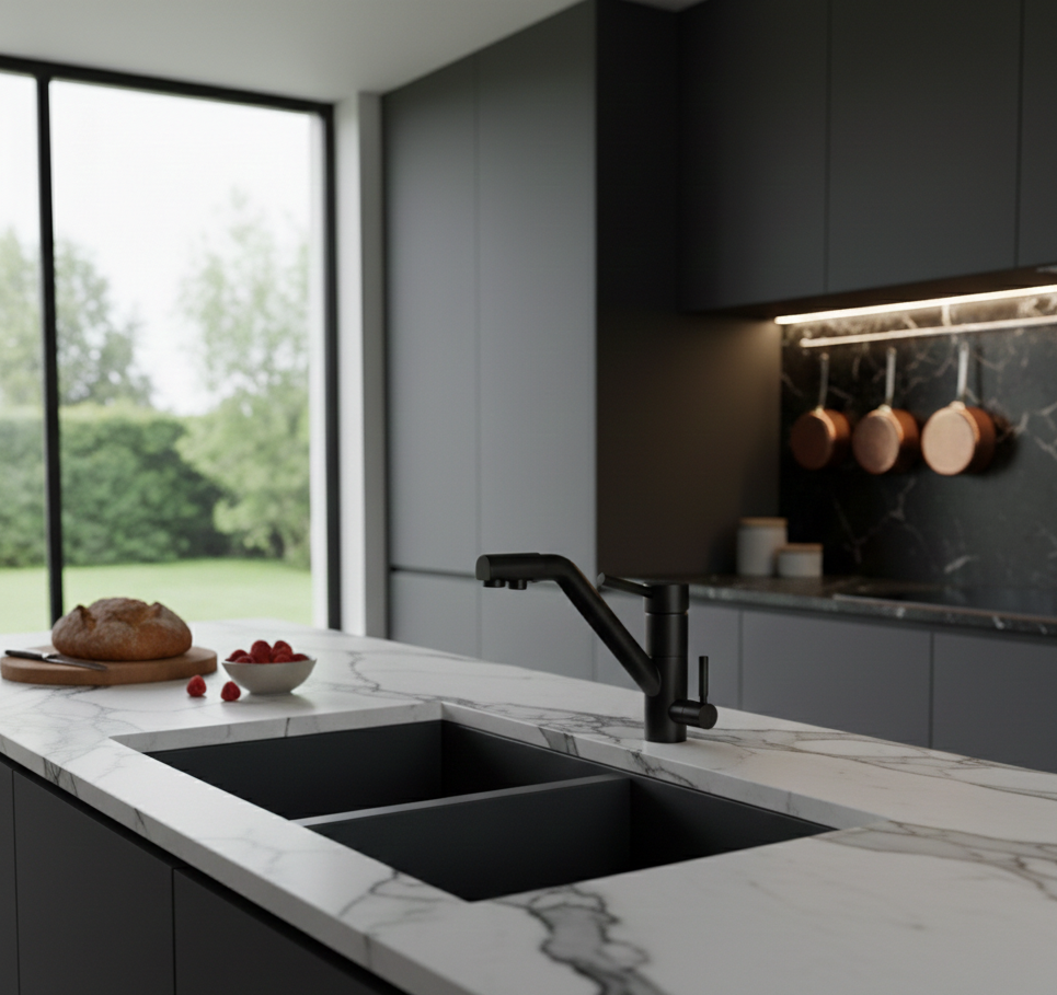 Finition Noir Mat Sophistiquée : Un look "Black Matte" ultra-tendance qui crée un contraste élégant avec tous types d'éviers (inox, granit ou céramique).