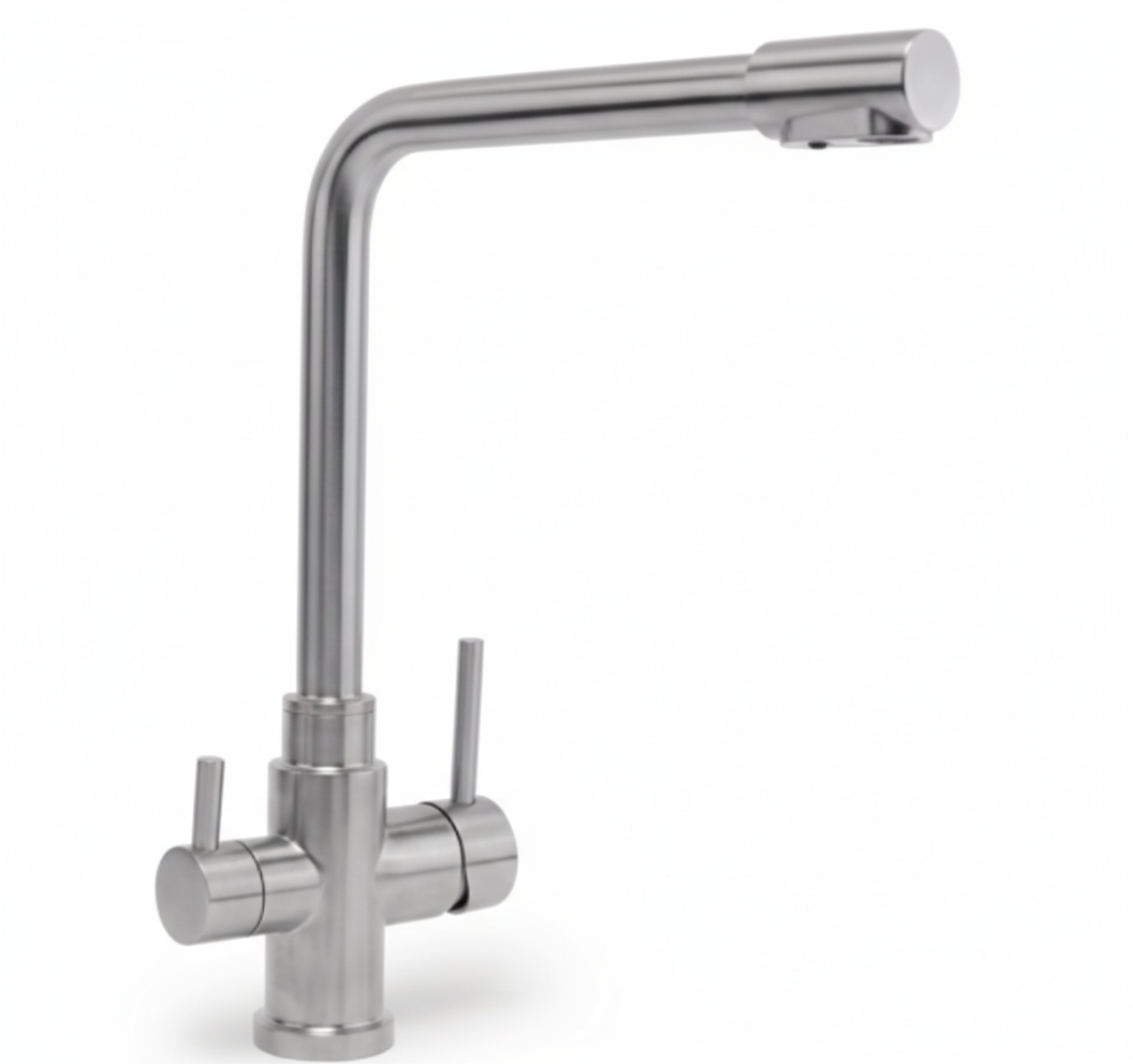 Grâce à sa structure en Inox 304, ce robinet est naturellement sans plomb et offre une résistance exceptionnelle à la corrosion et au temps. Il intègre un système à circuits séparés permettant de distribuer l'eau chaude, l'eau froide et l'eau filtrée via un bec unique, tout en garantissant que l'eau purifiée ne soit jamais en contact avec le circuit d'eau brute. Son design minimaliste et sa finition brossée apportent une touche de modernité brute et professionnelle à votre cuisine.