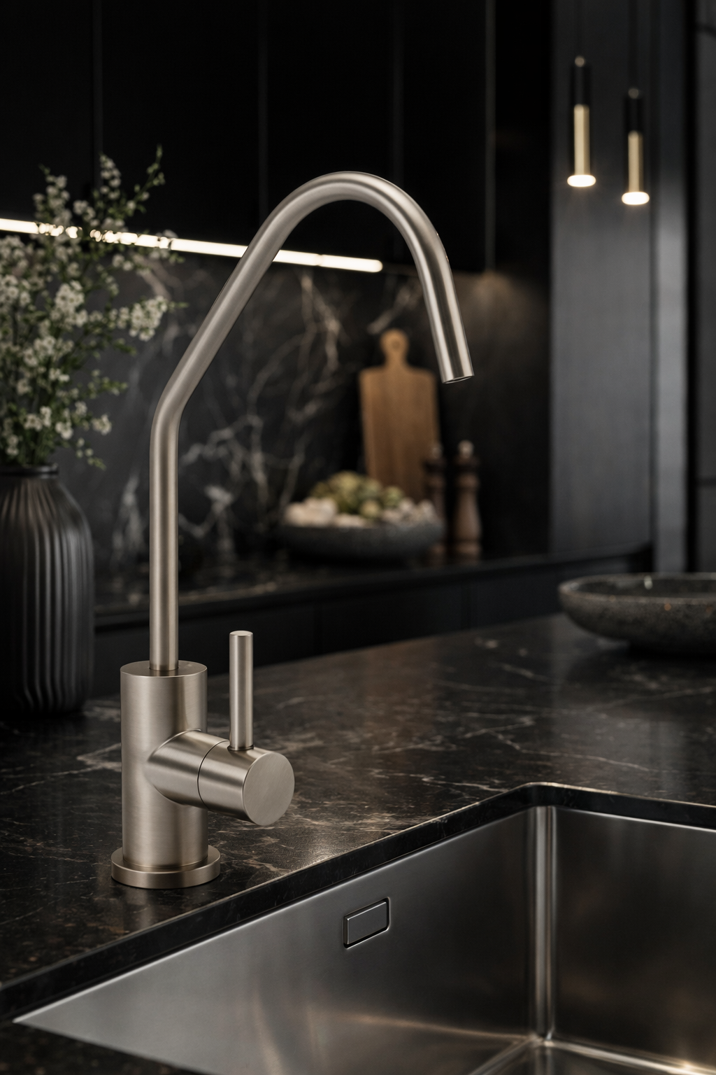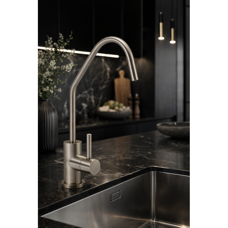 Avec sa finition Inox Brossé, le modèle SS109 se distingue par un design moderne aux lignes épurées et une conception sans plomb (Lead-Free). Ce robinet s'installe en complément de votre mitigeur principal et garantit que l'eau purifiée ne subit aucune migration métallique, préservant ainsi toute la qualité du travail effectué par vos filtres.