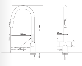 Bec Extractible & Extensible : Offre une portée étendue et une maniabilité exceptionnelle, facilitant toutes les tâches quotidiennes au-dessus de l'évier.
