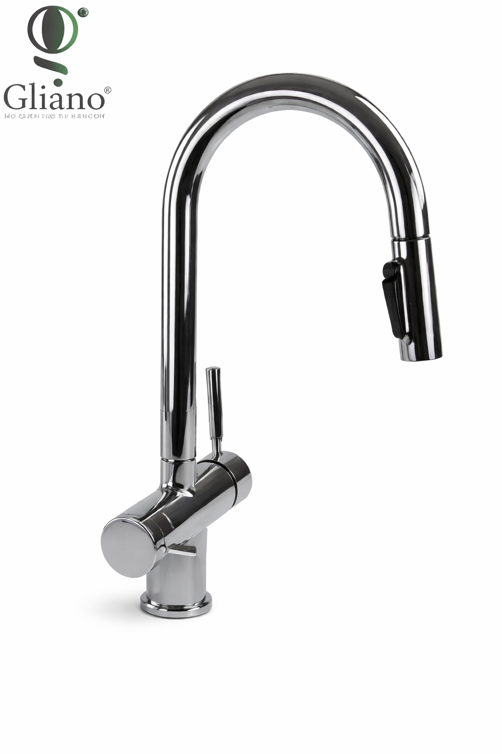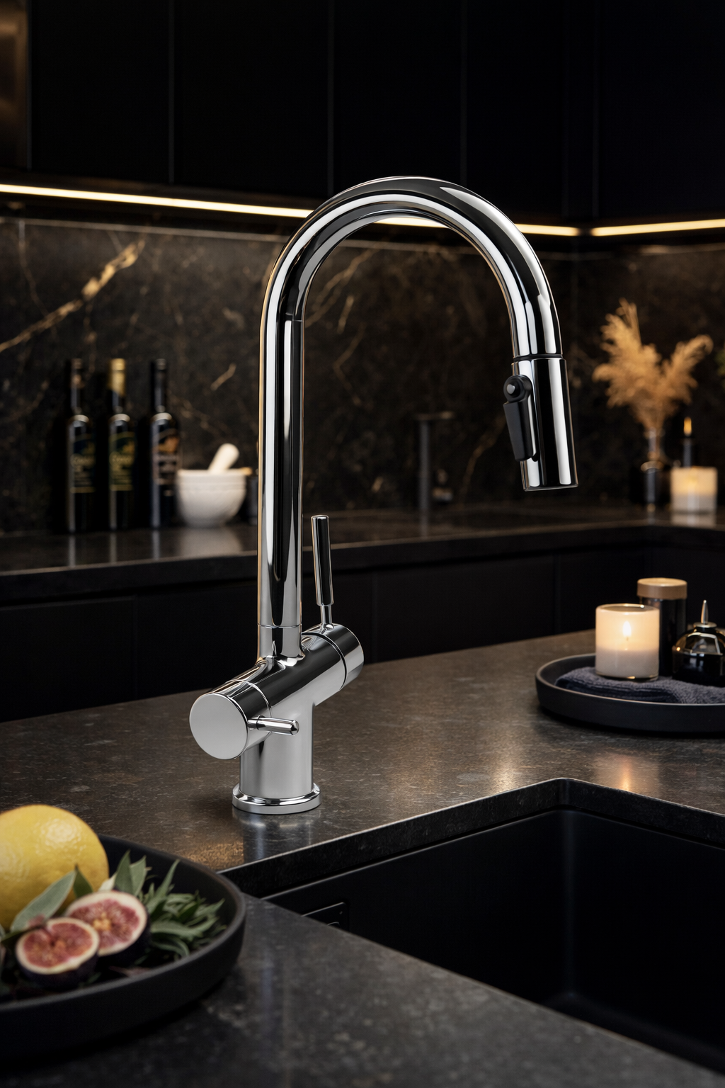 Le robinet de cuisine 3 voies GLIANO (Référence GLIANO-BR316-1) redéfinit le confort en cuisine en combinant pour la première fois la technologie de filtration d'eau et la praticité d'un bec extractible. Arborant une finition Chrome brillant, ce mitigeur intelligent permet de gérer l'eau chaude, l'eau froide et l'eau filtrée via un seul appareil, tout en offrant une flexibilité totale grâce à son flexible extensible.